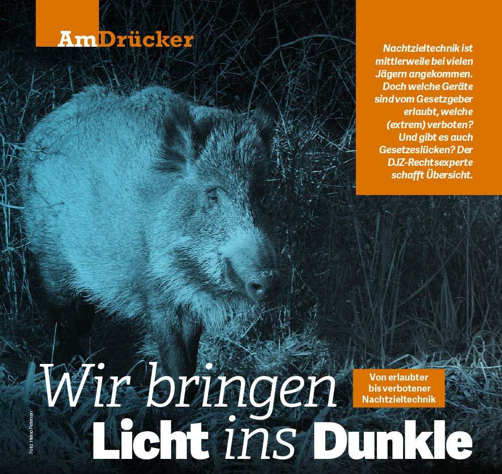 Unverhofft kommt oft“, sagt der Volksmund, und so ereilte mich kurz vor Fertigstellung des an sich für diese Ausgabe geplanten Artikels ein Anruf des Chefredakteurs Dr. Rolf Roosen: „Heiko – Du musst für die kommende Ausgabe unbedingt was über Nachtsichttechnik schreiben. Kriegst Du das hin?“ Klar kriege ich das hin. Allerdings lautet mein journalistisches Credo, jagdrechtliche Themen so zu formulieren, dass der DJZ-Leser am Ende des Artikels nicht eingeschlafen ist. Ich winde mich wie ein Aal. Doch so ist das mit uns Fußsoldaten – meine Argumente prallen an der Redaktionsleitung ab, wie eine .22 am Büffelschädel. „Egal – wir wollen das so. Leg los!“